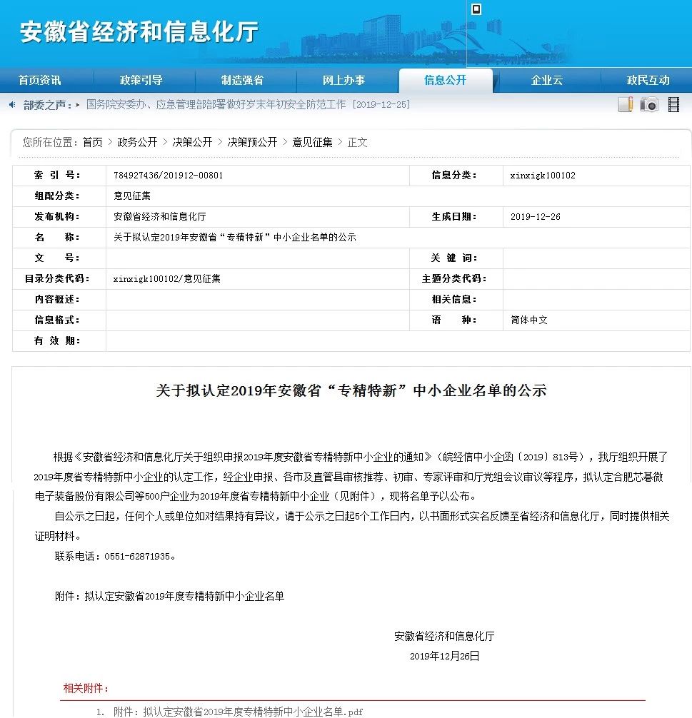 2019年12月26日,安徽省經(jīng)濟(jì)和信息化廳管理官網(wǎng)公示了安徽省“專精特新”中小企業(yè)名單,通潮精密榜上有名。